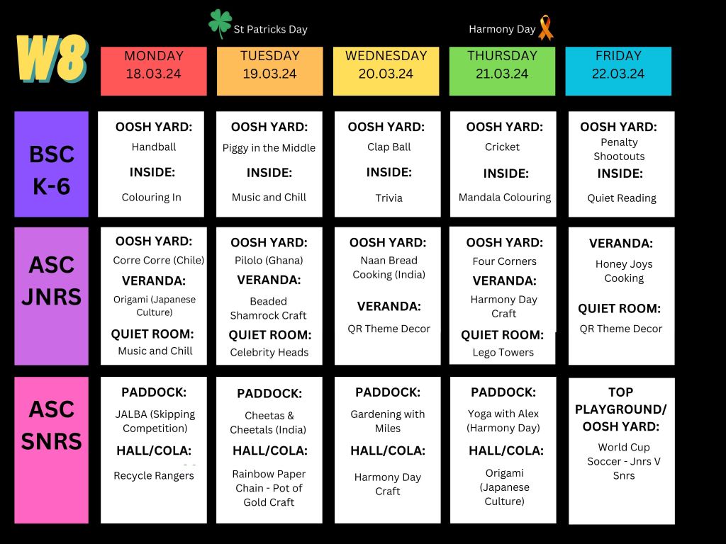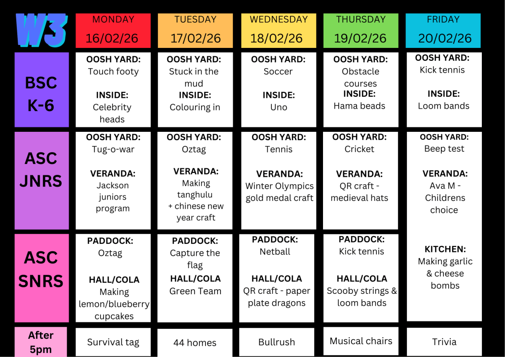 Please see below an example of our weekly program. We take careful consideration to best suit activities and learning programs for specific age groups!